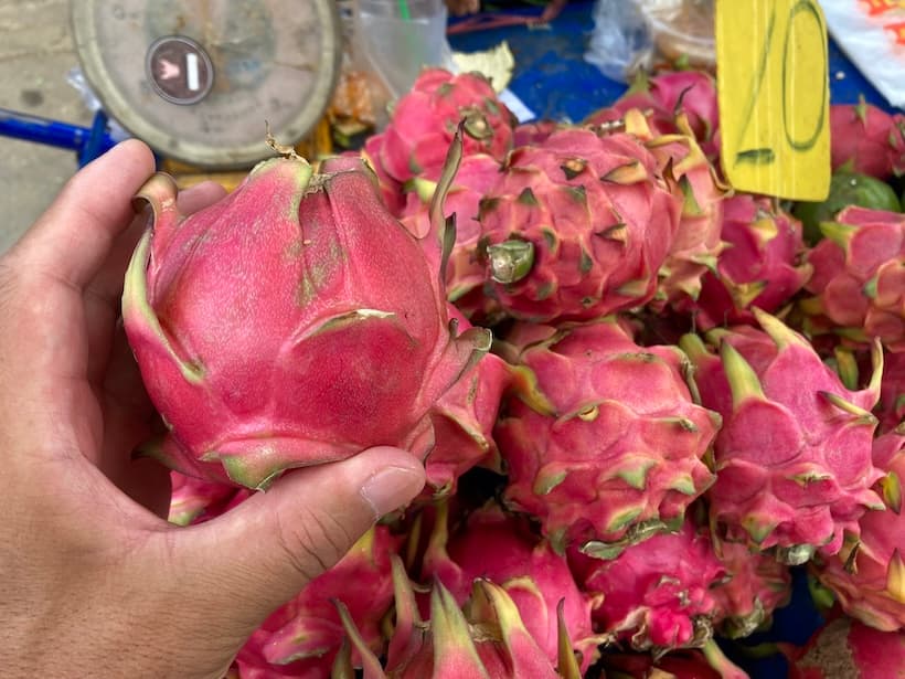 チェンマイ郊外にはドラゴンフルーツの農場が点在しており、雨季が終わりに差しかかる9月ごろには市場に山積みで並びます。